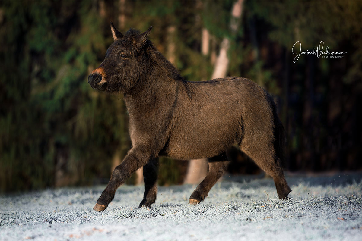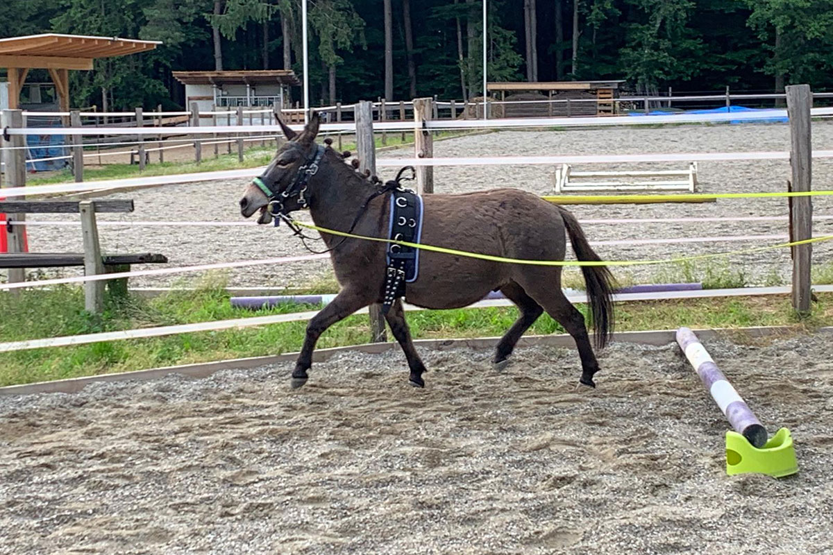 | Besonderheiten: | Erzieher für die Fohlen, Mischung zwischen Pony und Esel (Muli), wird geritten, Bodenarbeit |